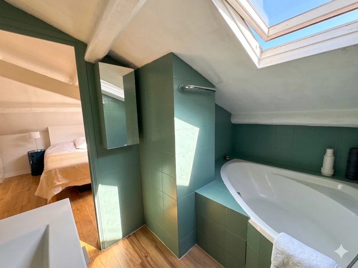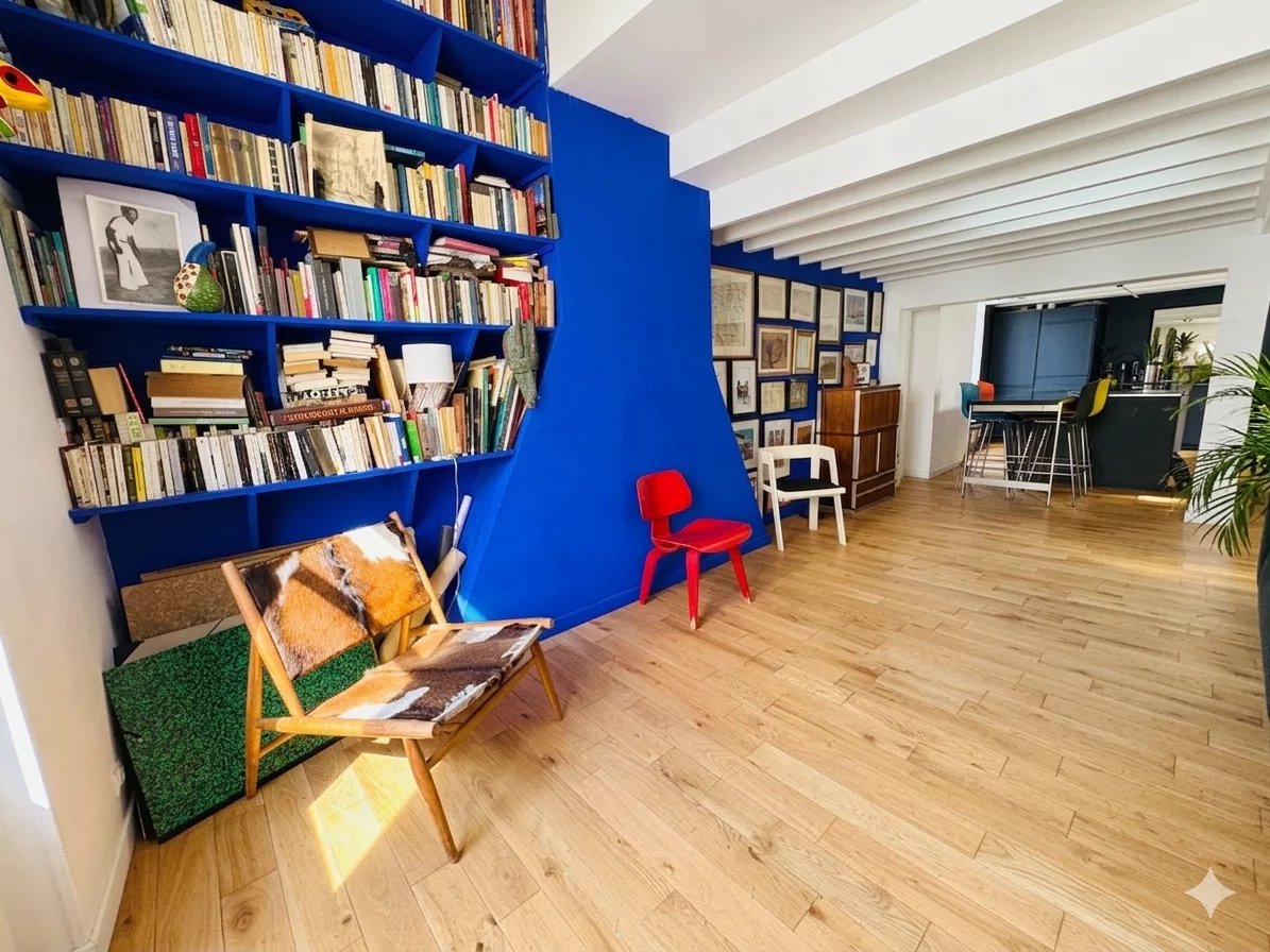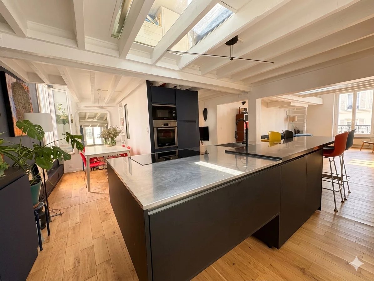 Il se compose d'une magnifique pièce de vie traversante, avec cuisine ouverte et îlot central, sublimée par trois verrières au plafond diffusant une lumière naturelle exceptionnelle.