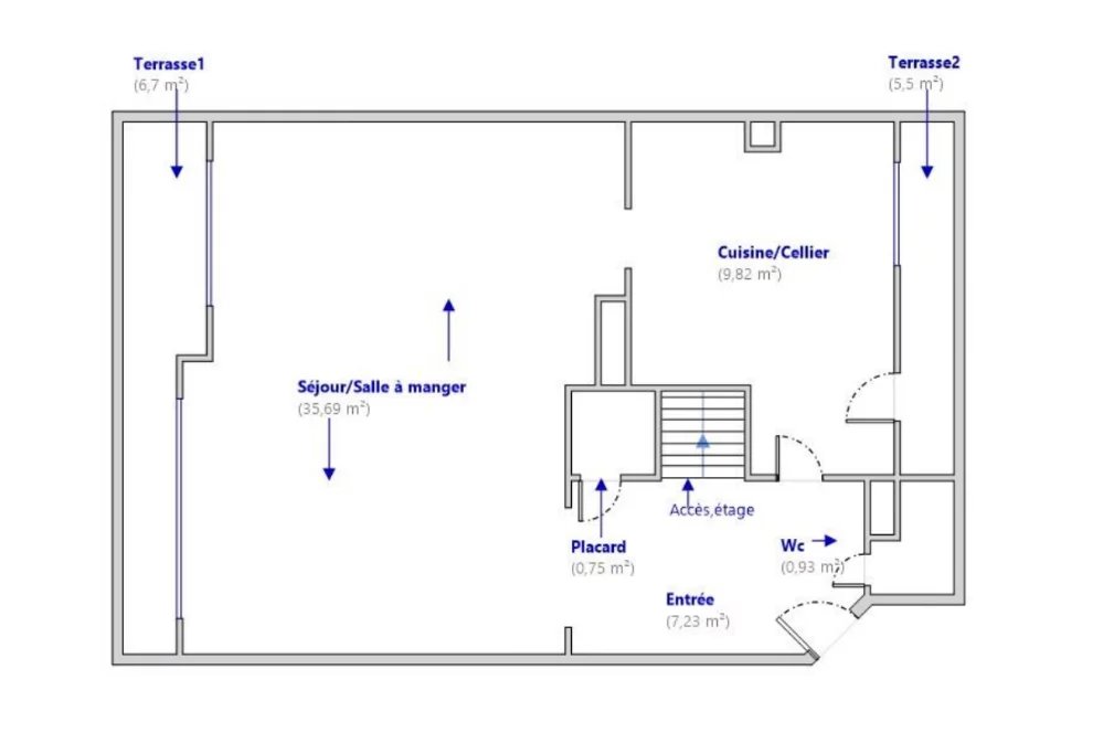 Cuisine ouverte sur une terrasse de l'autre. wc et rangements. Possibilité 3ème chambre.